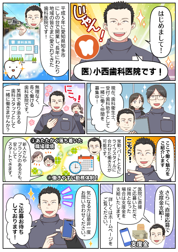 | 給与 | 【歯科衛生士】 (正社員) 週休2日制:月給320,000円~ 週休3日制:月給270,000円~ (パート) 時給1,700円~ 【受付・歯科助手】 (正社員) 週休2日:月給230,000円~ (パート)時給1,200円~ ※シフト制 |